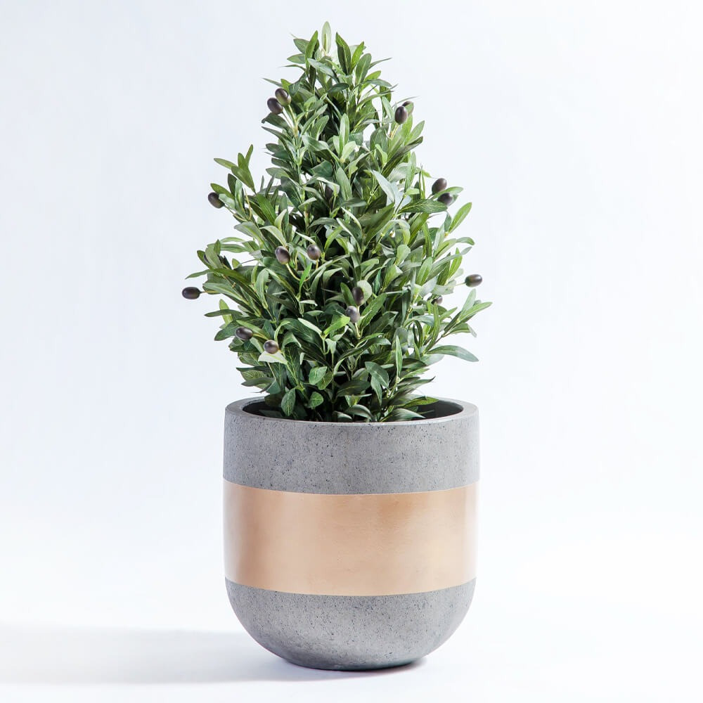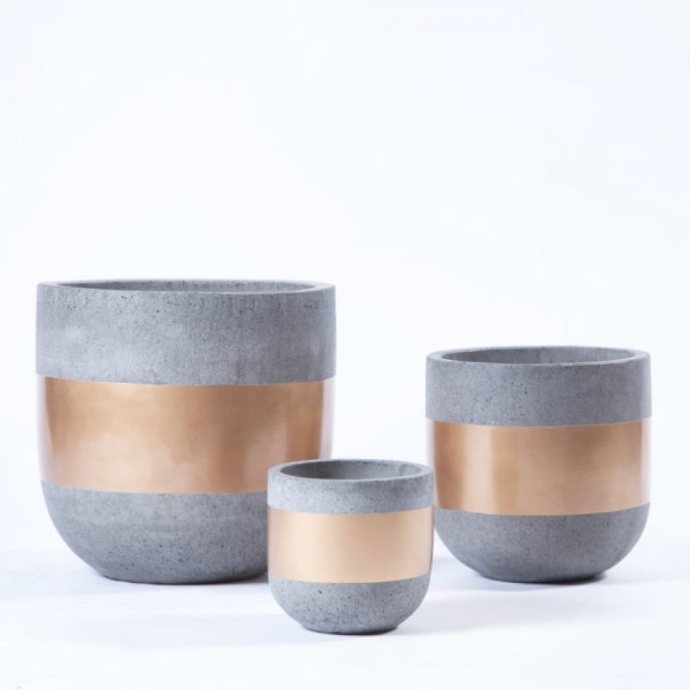 مراكن زرع إسمنتي عالي الجودة مغطى باللون الرمادي الكامل وحزام باللون الذهبي، يستخدم لزراعة وعناية النباتات ولأغراض التزيين الداخلي والخارجي وإضفاء لمسة جمالية للمنازل الراقية والقصور.