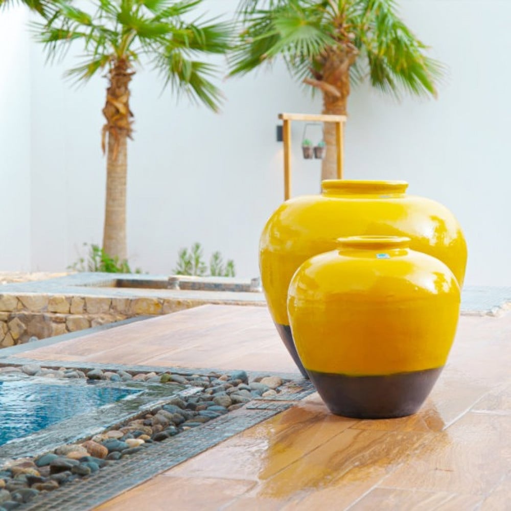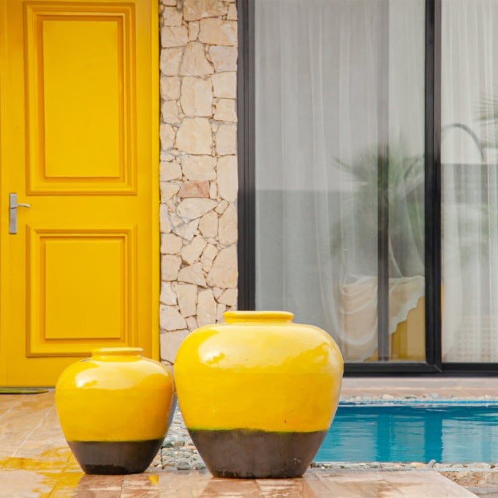 مراكن ديكور سيراميك عالية الجودة مغطاة باللون الاصفر والاسود، يستخدم للعناية بالنباتات ولأغراض التزيين الداخلي والخارجي وإضفاء لمسة جمالية مميزة للمنازل والقصور والحدائق .